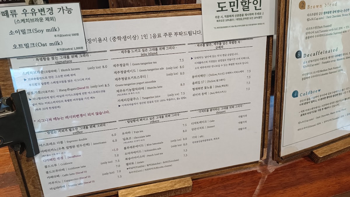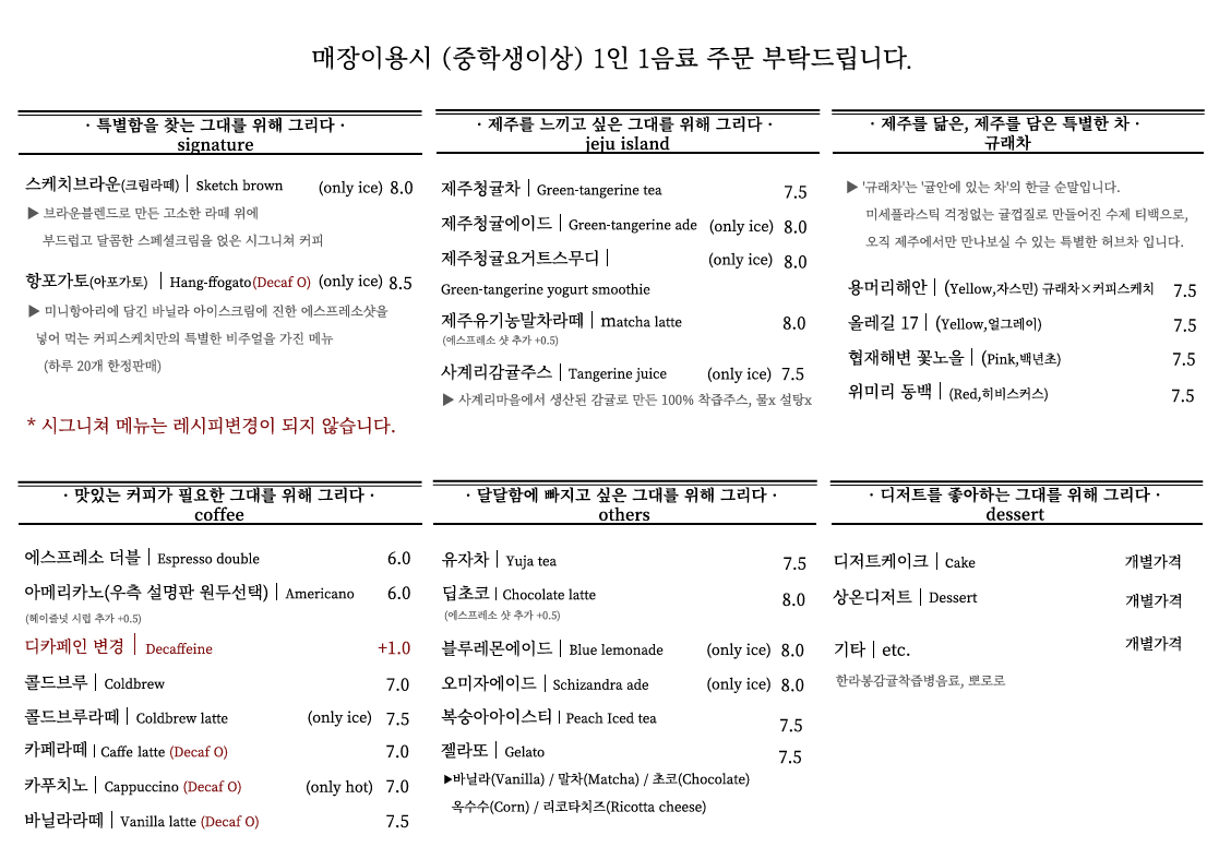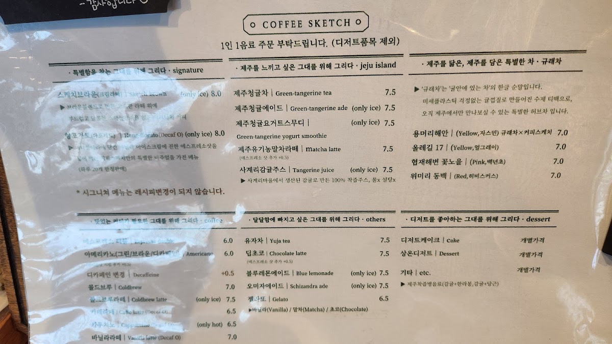 Highlights include delicate treats like 단밤케이크 (sweet chestnut cake) and the signature Browncheese Croffle, alongside a variety of warm and chilled beverages such as the Sketch Brown Coffee, Hangfforgato, and refreshing Blue Lemonade. These items invite a leisurely pace, perfect for enjoying gentle views of the coast or unwinding with friends.